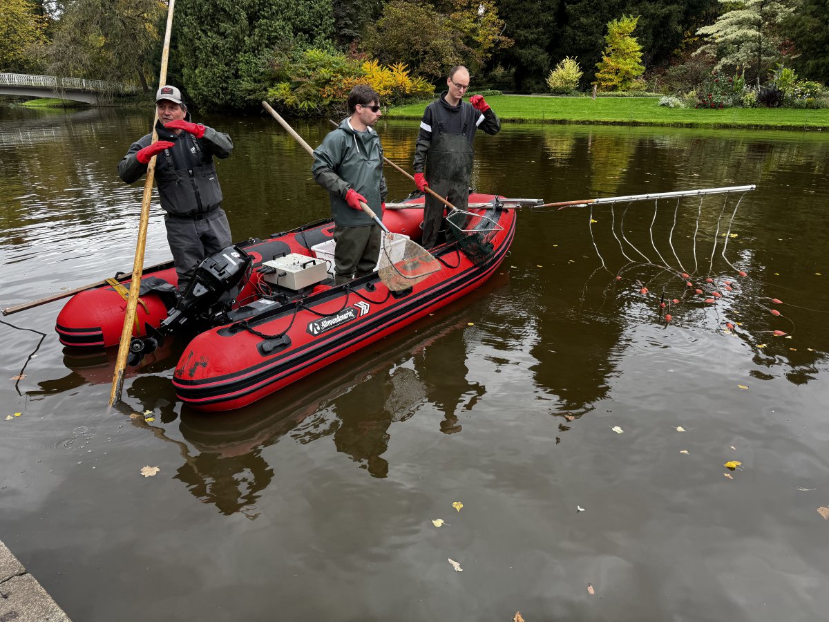 Die Aktion startete am Sonntag, den 19. Oktober 2025, mit der Elektrofischerei im Bassin der Insel Siebenbergen – einem unserer gepachteten Gewässer. Unter Leitung von Biologen wie Christoph Dümpelmann und mit Unterstützung von über 20 ehrenamtlichen Mitgliedern unseres Vereins werden die Fische mit einem Elektrofischgerät betäubt und schonend mit dem Kescher gefangen. Diese Methode wird bei kühleren Temperaturen angewendet, um Stress für die Tiere zu minimieren.